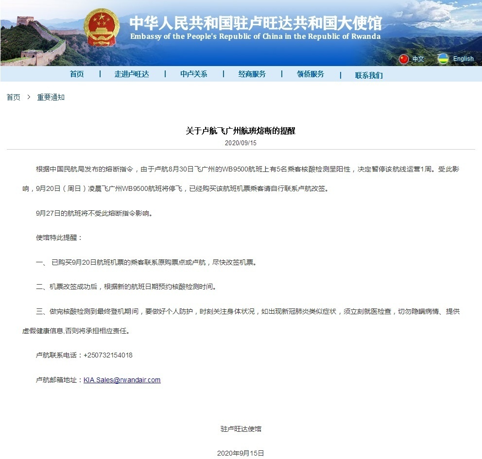 长沙晚报掌上长沙9月16日讯 据中国驻卢旺达大使馆网站:9月15日,中国驻卢旺达大使馆在其官方网站发布《关于卢航飞广州航班熔断的提醒》,全文内容如下: